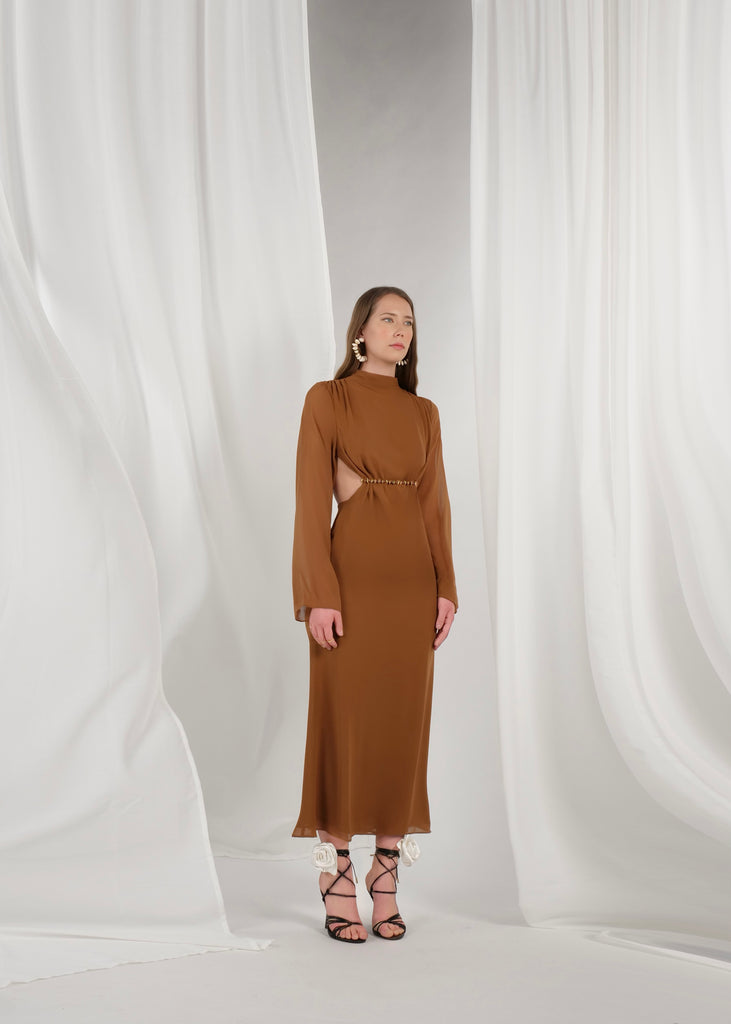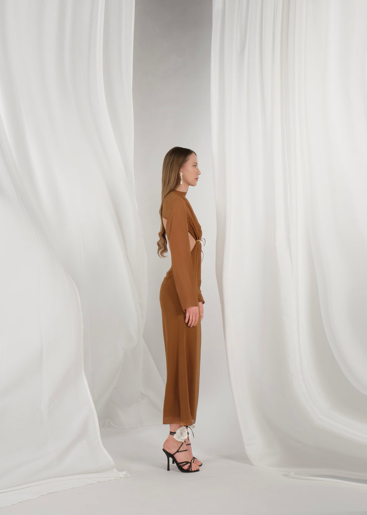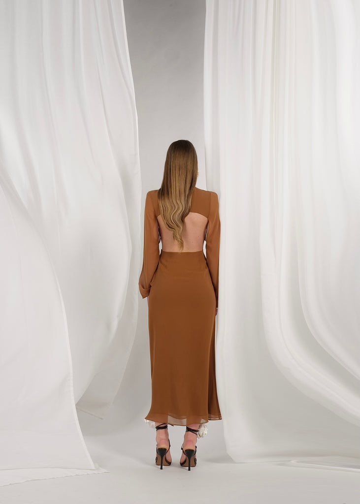 Max silk dress, backless, to tie up at the front, belt with beads, shoulder pads, loose sleeves