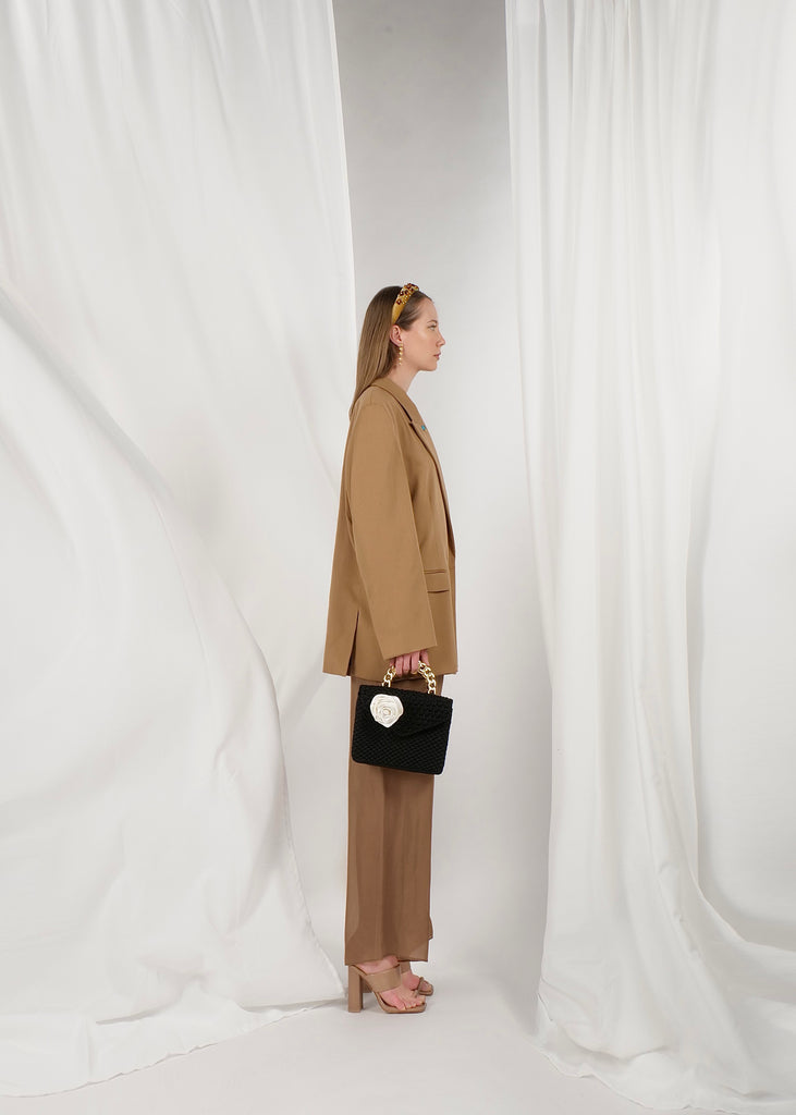 Oversized Blazer with loose sleeves and slits, beads and shoulder pads. Matching interior lining. Front flap pockets and chest welt pocket. Hidden button closure.