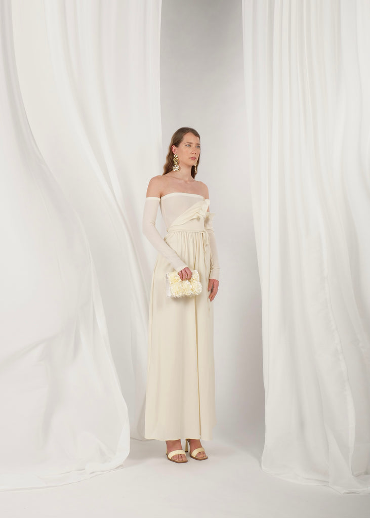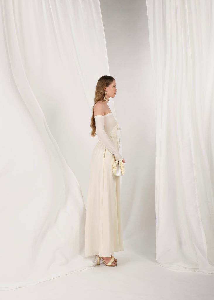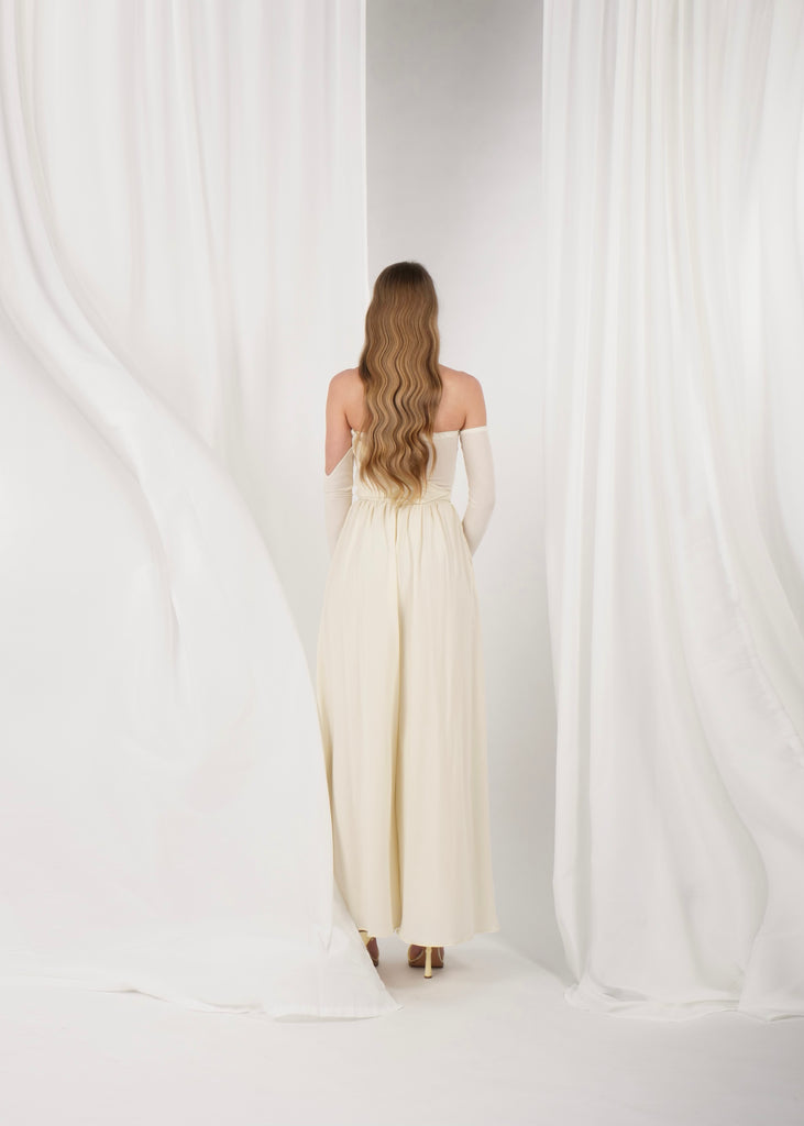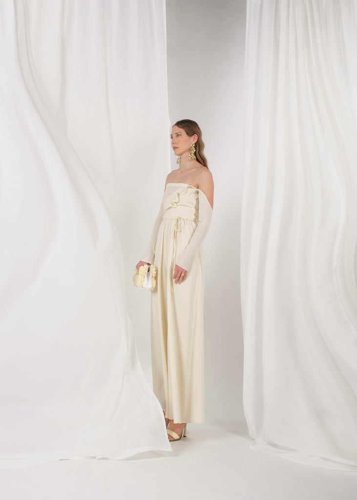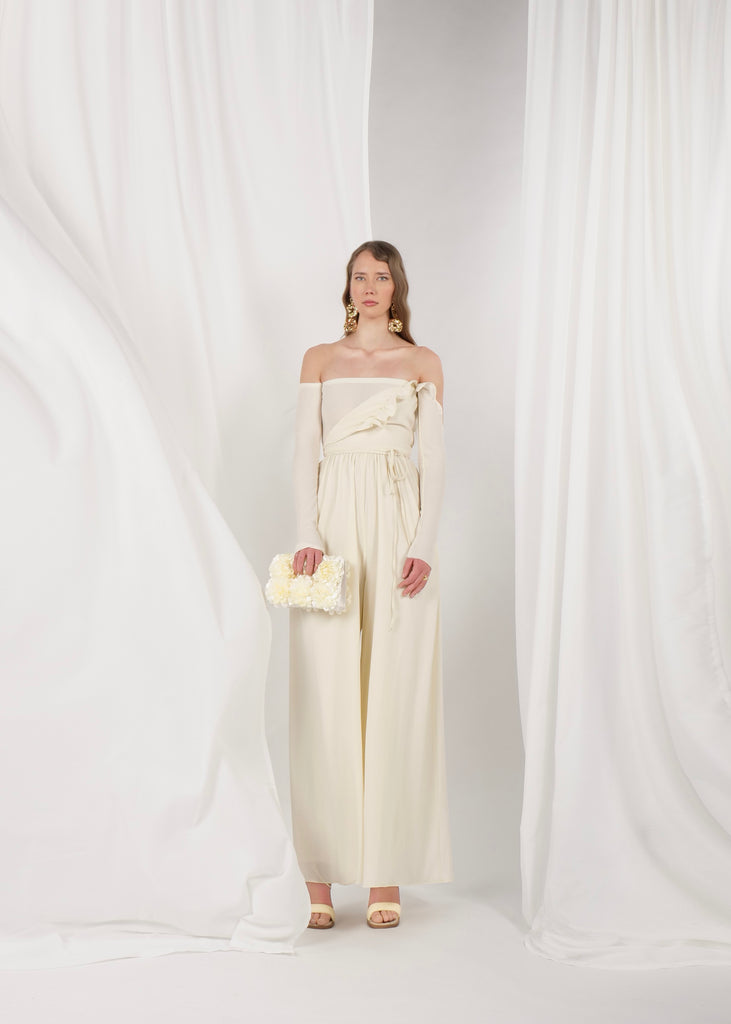 Asymmetrical overall with asymmetrical sleeves, strapless, raffled, long wide leg
